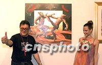澳大利亚画家查尔斯·比利奇,7月11日晚在莫斯科展示新近创作的中国系列兵马俑油画和兵马俑牛仔服饰。中新社记者 王瑶 摄