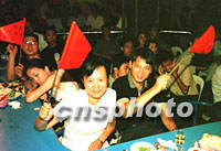 福州市众多百姓十三晚走出家门来到酒吧、咖啡屋等公众场所,通过观看电视、收听收音机等方式关注北京申奥进展。中新社图 刘可耕 摄