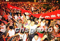 13日夜,福州市民聚集在五一广场,为北京申奥成功欢呼。中新社图 华小锐 摄