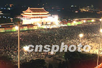 北京天安门广场十三日夜人潮涌动,数以十万计的民众彻夜不眠庆祝北京申奥成功。中新社记者 毛建军 摄