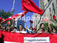 七月十三日,北京申奥成功,多伦多华人华侨在联合火车站前街举办庆祝活动。中新社记者 徐德金 摄