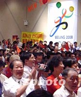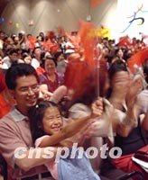 ![]() 美东时间十三日晚上,八百多名纽约华人华侨和留学生代表参加中国驻纽约总领馆举行的招待会。他们挥舞手中的五星红旗,庆祝北京获得二○○八年奥运主办权。中新社记者 陈建 摄