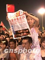 图文:北京各大传媒大量报道申奥成功 2001年07月14日 22:16 ![]() 《人民日报》报道北京申奥成功的喜讯。中新社记者 毛建军 摄 ![]() 《北京青年报》报道北京申奥成功的喜讯。中新社图 刘殊瑾 摄 中新社北京七月十四日电(记者叶小刚)北京申奥成功喜讯传来,京城各大传媒均以大量版面、播出时段报道了这一令中国亿万人民欢呼喜悦的消息。 《人民日报》今天用四个整版的篇幅予以报道,头版头条位置以《首都各界欢庆北京申办二00八年奥运会成功》为题报道北京庆祝的盛况,右下角刊发社论《谱写奥运史上最壮丽的篇章》。第二版以大半版篇幅发表了特写《为了跨世纪的梦》。 《北京日报》更以十二个版的篇幅重拳出击,一版标题位置套红大字:“二00八奥运:北京”。下方一张北京民众在天安门广场欢庆的大幅照片几乎占据了整个版面。第二版到第十二版分别以“决战莫斯科”、“历史的跨越”、“京城不眠夜”、“沸腾长安夜”、“万民同欢乐”、“欢歌遍神州”等为题从不同角度进行了报道。 中国中央电视台从昨晚申奥成功后以不停机、不间断的方式报道北京和全国各地欢庆的盛况。今晚新闻联播节目从预定的三十分钟延长至五十二分钟,其中五十分钟是欢庆申奥成功内容。 北京其他主要传媒《北京青年报》、《光明日报》、《中国青年报》等也都以大量篇幅报道了这一特大喜讯。(完) |