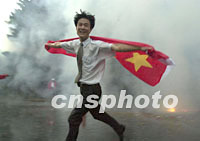 一名中国青年高举五星红旗,冒雨在中国驻莫斯科大使馆鸣放的鞭炮烟火中狂奔,欢呼北京申办奥运会成功。中新社记者 贾国荣 摄