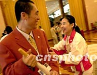 中国著名导演张艺谋与奥运会冠军刘璇,在中国驻莫斯科大使馆互相祝贺北京申办奥运会成功。中新社记者 贾国荣 摄