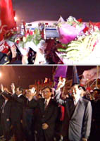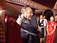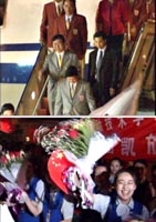 ![]() 北京奥运会申办代表团七月十四日晚载誉从莫斯科回到北京。 ![]() 中国国务院副总理李岚清十四日晚率领北京奥运会申办代表从莫斯科载誉回到北京。图为,李岚清在机场与前来迎接的国家副主席胡锦涛热烈拥抱。