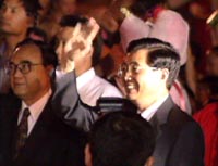 组图:北京申奥代表团7月14日晚载誉归来 2001年07月15日 18:34 ![]() 中共中央政治局常委、中国国家副主席、中央军委副主席胡锦涛(右一),十四日晚在北京首都机场热烈欢迎北京申办奥运会代表团从莫斯科载誉归来。 ![]() 中国国家副主席胡锦涛十四日晚在北京首都机场迎接国务院副总理李岚清率领的北京奥运会申办代表团回到北京。