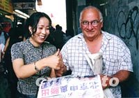 一位名叫麦克的美国人(右)在纽约街头向派送“号外”的华裔少妇季小姐祝贺北京赢得奥运主办权。中新社记者 郭健 摄
