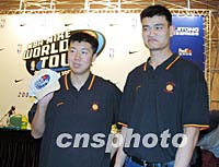 图:王治郅、姚明将参加NBA星光大赛 2001年07月17日 21:40 ![]() 一场原汁原味的NBA比赛将于九月十六日首次在上海举行。这场名为NBA NIKE星光大赛对赛的阵容是由NBA球星以及中国当地最佳球员混合组成。图为王治郅、姚明在上海表示要尽力打好比赛。中新社记者 潘索菲 摄