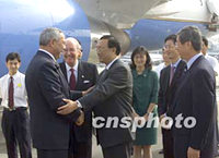 ![]() 美国国务卿鲍威尔二十八日八时十五分抵达北京国际机场,开始对中国的访问。中新社记者 满会乔 摄 ![]() 美国国务卿鲍威尔二十八日上午八时十五分抵达北京国际机场,开始对中国的访问。中国驻美大使杨洁篪和美国驻华大使雷德等前往机场迎接。中新社记者 满会乔 摄