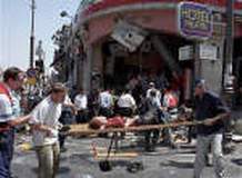 耶路撒冷爆炸:以内政部长说十七人死亡(图) 2001年08月09日 22:28 一名在爆炸事件中受伤的妇女正被抬上救护车。 | |||