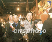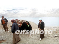 组图:八月的西藏 2001年08月14日 16:50 ![]() 八月是西藏旅游的黄金季节,藏民牵着牦牛在美丽的羊卓雍湖边迎候游人,他们以为游客提供照相服务而增加自己的收入。中新社记者 满会乔 摄 ![]() 八月的西藏拉萨,前往大昭寺朝拜释迦牟尼佛像的藏民络绎不绝。相传这里供奉的释迦牟尼佛像为唐朝初年文成公主带入西藏。中新社记者 满会乔 摄