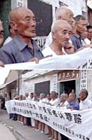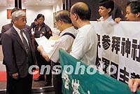 图:江苏民众抗议小泉参拜靖国神社 2001年08月15日 17:19 ![]() 中国江苏省崇山村村民,十五日在村委会前集会,抗议日本首相小泉参拜供奉着二战甲级战犯的靖国神社。日本侵华期间,有上百名崇山村民,无辜惨死在日本于此地进行的细菌战之中。 ![]() 香港多个团体15日举行示威游行,抗议日本首相小泉纯一郎参拜靖国神社。图为香港教联会向日本驻港总领事馆递交抗议信函。中新社图 卢峰 摄