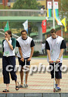 来自澳大利亚的游泳运动员十九日登上滑行车,在大运村里悠闲地享受雨后清新的空气。中新社记者 郑萍萍 摄