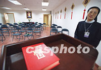 戴修女十九日在大运村天主教祈祷室内清理陈设。运动员村还特别为信奉基督教、伊斯兰教、佛教的各国运动员设立了宗教活动场所。中新社记者 郑萍萍 摄