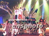 第二十一届世界大学生运会开幕式二十日在北京工人体育场进行总彩排,图为彩车经过主看台。中新社记者 刘殊瑾 摄