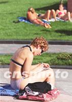 身穿三点式的波兰女运动员二十二日在大运村内的草坪上享受日光浴。中新社记者 郑萍萍 摄