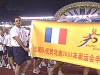 图:法国代表团祝贺北京申奥成功 2001年08月22日 21:17 ![]() 大运会法国代表团入场时打出了祝贺北京2008年申奥成功的横幅。在上个月的国际奥委会第112次全会上,北京战胜了多伦多、巴黎等城市,获得了2008年奥运会的主办权。