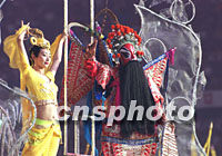 刚柔相济的敦煌飞天、京剧武生在22日的大运会开幕式晚会上共同演绎中国文化的精髓。中新社图 郑萍萍 摄
