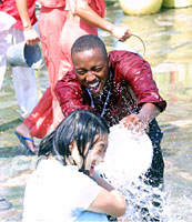 图:中外大学生共渡泼水节 2001年08月25日 16:57 ![]() 第二十一届世界大学生运动会二十五日在北京中华民族园举办中外大学生联欢活动,傣族村里的泼水节吸引众多中外大学生运动员上场一试,虽浑身湿透,仍然兴致勃勃。中新社记者 李刚 摄 |