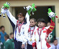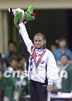 组图:俄罗斯选手囊括女子体操个人全能冠亚军 2001年08月25日 19:15 ![]() 第二十一届大运会女子体操个人全能项目比赛二十五日下午在首都体育馆结束,俄罗斯选手埃霍娃、普里夫诺娃获得该项目冠亚军,中国小将白春月屈居第三。中新社记者 郑萍萍 摄 ![]() 第二十一届大运会女子体操个人全能项目比赛二十五日下午在首都体育馆结束,俄罗斯选手埃霍娃获得该项目冠军。中新社记者 郑萍萍 摄