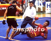 八月二十七日,九运会武术散打比赛在广东省南海市拉开帷幕,预赛将决出六个项目十一个级别的八强。中新社记者 陈文 摄