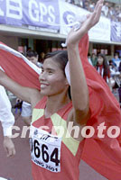 中国长跑选手董艳梅二十八日获得田径一万米比赛金牌后,身披国旗向观众致意。中新社记者 李刚 摄