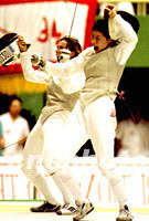 组图:中国女将挑落世界女剑客 2001年08月29日 10:37 ![]() 中国女将孟洁(右)在二十八日的花剑团体决赛中以一剑险胜世界排名第一的意大利名将维扎利。最后一剑双方几乎同时刺中有效部位,两人兴奋地跳起。中新社记者 郑萍萍 摄 ![]() 在大运会女子花剑团体决赛中,由女子花剑世界排名第一的维扎利领衔的意大利队意外地败给中国队后,意大利队员禁不住泪洒赛场。中新社记者 郑萍萍 摄