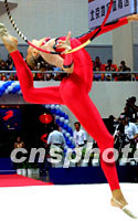 观赏性较强的大运会艺术体操比赛二十九日下午开赛,图为乌克兰选手贝洛娃在表演圈操。中新社记者 刘殊瑾 摄