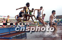 在第21届大运会二十九日举行的男子三千米障碍赛中,各国选手奋勇争先,互不相让,竞争十分激烈。中新社记者 李刚 摄
