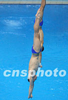 大运会男子双人10米跳台决赛中一对美国运动员的入水动作几近完美。中新社图 刘殊瑾 摄