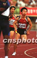 中国澳门特区的四员小将在男子4×100米接力中奋力拼搏。中新社图 郑萍萍 摄