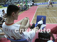 ![]() 中国男篮主力中锋姚明在大运会男篮决赛中旧伤复发。在场外疗伤的姚明只能无奈地看着队友一次次失去比分。中新社记者 李刚 摄