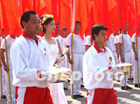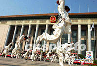 组图:天安门前点燃九运会火炬 2001年09月11日 15:17 ![]() 九月十一日上午,中国首枚奥运金牌获得者许海峰和广东优秀运动员孙淑伟,分别捧着从北京世纪坛和深圳采集的火种,汇聚在北京天安门前点燃九运会的火炬。中新社记者 贾国荣 摄 ![]() 一百名武艺高强的少年儿童十一日在北京天安门广场前小试身手,为第九届全国运动会火炬点火起跑助兴。中新社记者 贾国荣 摄
