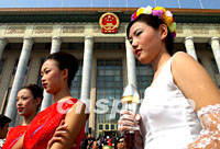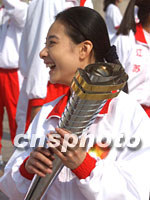 ![]() 身穿红与白裙装的火炬礼仪小姐,十一日在北京人民大会堂东门外广场为九运会迎送火炬传递。中新社记者 贾国荣 摄 ![]() 中国优秀体操女将刘旋,十一日在北京高兴地担任九运会的火炬传递手。中新社记者 贾国荣 摄