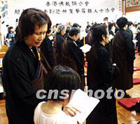 图文:香港佛联举行法会超度“九一一”罹难者 2001年09月16日 01:09 ![]() 香港佛教联合会15日下午为美国「九一一事件」罹难者举办的超度法会上,一对母子一起诵读《心经》,祈祝世界和平。中新社图 董会峰 摄