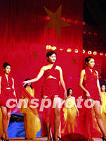 ![]() 正在青岛举行的2001中国青岛时装周暨服装服饰博览会,国庆节之际举行大型文艺晚会“海韵霓裳”。图为五星红旗下模特表演。中新社记者 钱兴强 摄 ![]() 正在青岛举行的2001中国青岛时装周暨服装服饰博览会,国庆节之际举行大型文艺晚会“海韵霓裳”。图为青岛纺织服装表演队,展示新款面料服装。中新社记者 钱兴强 摄