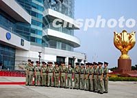10月1日国庆节,香港警察在金紫荆广场留影。中新社图 任晨鸣 摄