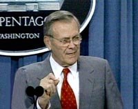 图:美国防部长说:不能让塔利班做恐怖分子的港湾 2001年10月08日 10:36 ![]() 美国东部时间十月七日上午,美国国防部长拉姆斯菲尔德在五角大楼的新闻发布会上说:美国今天对阿富汗进行军事攻击,目标是让恐怖分子无法再使用塔利班作为他们的港湾。攻击目标主要是塔利班的机场,还有其它的军事设施和军事基地。 |