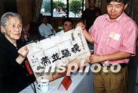图:辛亥革命后人给长乐市村民送当年实物 2001年10月12日 18:15 ![]() 辛亥革命老人、孙中山先生秘书黄展云的女儿黄以雍,十一日以九十三岁的高龄专程赴长乐市,为其父于一九二七年创办的“营前模范村”后人林泉送上父亲当年亲笔提写的匾额。中新社图 陈勇 摄 |