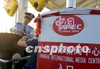 图:APEC会议新闻中心出入关口 2001年10月13日 19:27 ![]() 本届APEC会议的新闻发布厅设置在上海东方明珠大厦,目前出入大厦的人员都必须经过门口警卫的严格证件检查。中新社图 刘殊瑾 摄 |