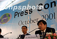 图:秦晓、霍建国认为APEC作用重要 2001年10月15日 22:06 ![]() APEC工商咨询理事会主席秦晓(左)、秘书长霍建国十五日在上海APEC新闻发布会上表示,APEC对当前世界前沿问题进行探讨并达成共识具有重要作用。中新社记者 潘索菲 摄 |