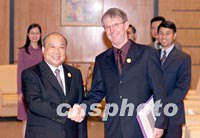 图:石广生会见新西兰贸易谈判部长 2001年10月16日 16:36 ![]() 中国对外经济贸易合作部长石广生(左)十六日在上海国际会议中心会见前来参加亚太经合组织(APEC)会议的新西兰贸易谈判部长吉姆·萨顿。中新社记者 毛建军 摄 |