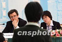 组图:APEC贸投会执行主席召开新闻发布会 2001年10月17日 15:29 ![]() APEC贸易投资委员会执行主席GERMAN KING(左),十七日在上海国际新闻中心召开新闻发布会,他在回答中外记者提问时说,贸易和投资自由化的推动将有利于减弱恐怖活动对世界经济的不良影响。中新社记者 王瑶 摄 ![]() 身着旗袍的上海小姐为APEC会议服务,在十七日召开的新闻发布会上,APEC贸易投资委员会执行主席GERMAN KING向服务小姐点头致谢。中新社记者 王瑶 摄