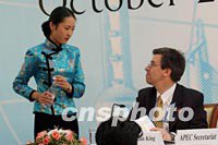 图文:APEC官员呼吁加快贸易和投资自由化 2001年10月17日 17:56 ![]() APEC贸易投资委员会执行主席GERMAN KING(左),十七日在上海国际新闻中心召开新闻发布会,他在回答中外记者提问时说,贸易和投资自由化的推动将有利于减弱恐怖活动对世界经济的不良影响。中新社记者 王瑶 摄 ![]() 身着旗袍的上海小姐为APEC会议服务,在十七日召开的新闻发布会上,APEC贸易投资委员会执行主席GERMAN KING向服务小姐点头致谢。中新社记者 王瑶 摄