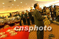 ![]() 2001年APEC会议筹委会秘书长、中国外交部副部长王光亚十七日在上海国际新闻中心举行招待酒会,并在会上向参加会议报道的中外记者致感谢词。中新社记者 王瑶 摄