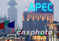 十月上海的黄昏华灯初上,APEC霓虹灯与彩旗交相辉映。中新社记者 贾国荣 摄