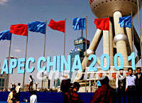 上海浦东十八日新竖起巨幅APEC标语和蓝色大台,休假的市民们纷纷来此感受盛会的欢乐。中新社记者 贾国荣 摄