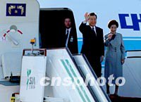 韩国总统金大中和夫人乘坐专机十八日下午抵达上海浦东国际机场,出席APEC峰会。中新社记者 贾国荣 摄