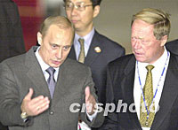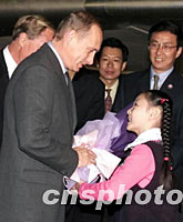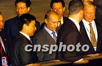 组图:俄罗斯总统普京抵达上海 2001年10月18日 20:40 ![]() 10月18日,前来参加亚太经合组织领导人非正式会议的俄罗斯总统弗拉基米尔·普京抵达上海。这是普京总统下飞机后接受中国儿童献花。中新社图 ![]() 出席APEC领导人非正式会议的俄罗斯总统普京十八日乘专机抵达上海。中新社记者 王瑶 摄